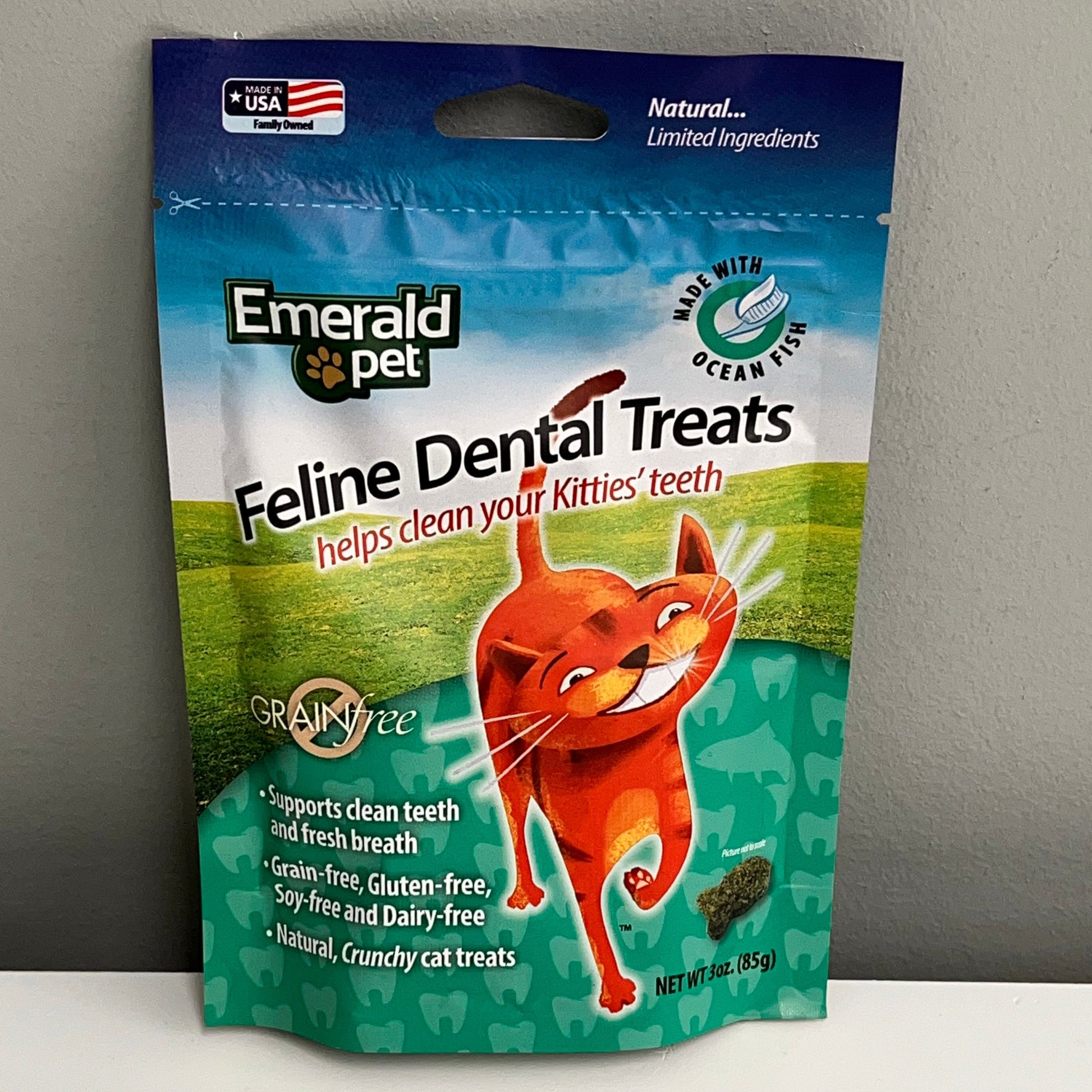 Emerald Pet Feline Dental Treats are the healthy grain-free dental solution your cat will love! These all-natural and nutritious crunchy treats are irresistible to cats. Discerning pet owners will love that theyre grain-free, gluten-free, soy-free, dairy-free, and made in the USA with US ingredients. Whimsical fish-shaped treats are big enough to encourage chewing versus just swallowing for maximum dental health. With innovative ingredients used to fight plaque and tartar, these delicious treats are rewarding for cats and their parents.