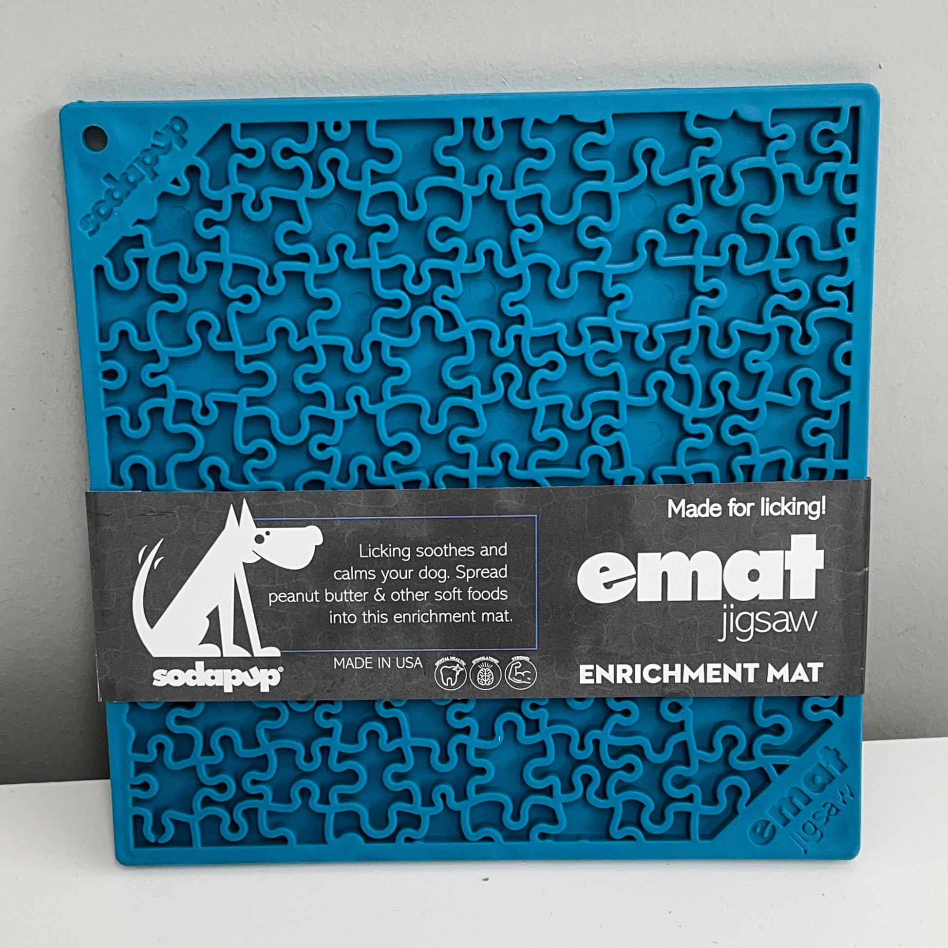 Smooth the mat with soft, spreadable food and serve—or freeze first for even longer engagement. Licking releases relaxing hormones, helping calm and ease anxiety. The effort and focus to get the food out of the grooves also serve to distract from a stressful situations or boredom. Saliva production aids digestion and promotes tooth and gum health. Plus it takes a while to get at all the treats, making for a long-lasting, occupying treat.