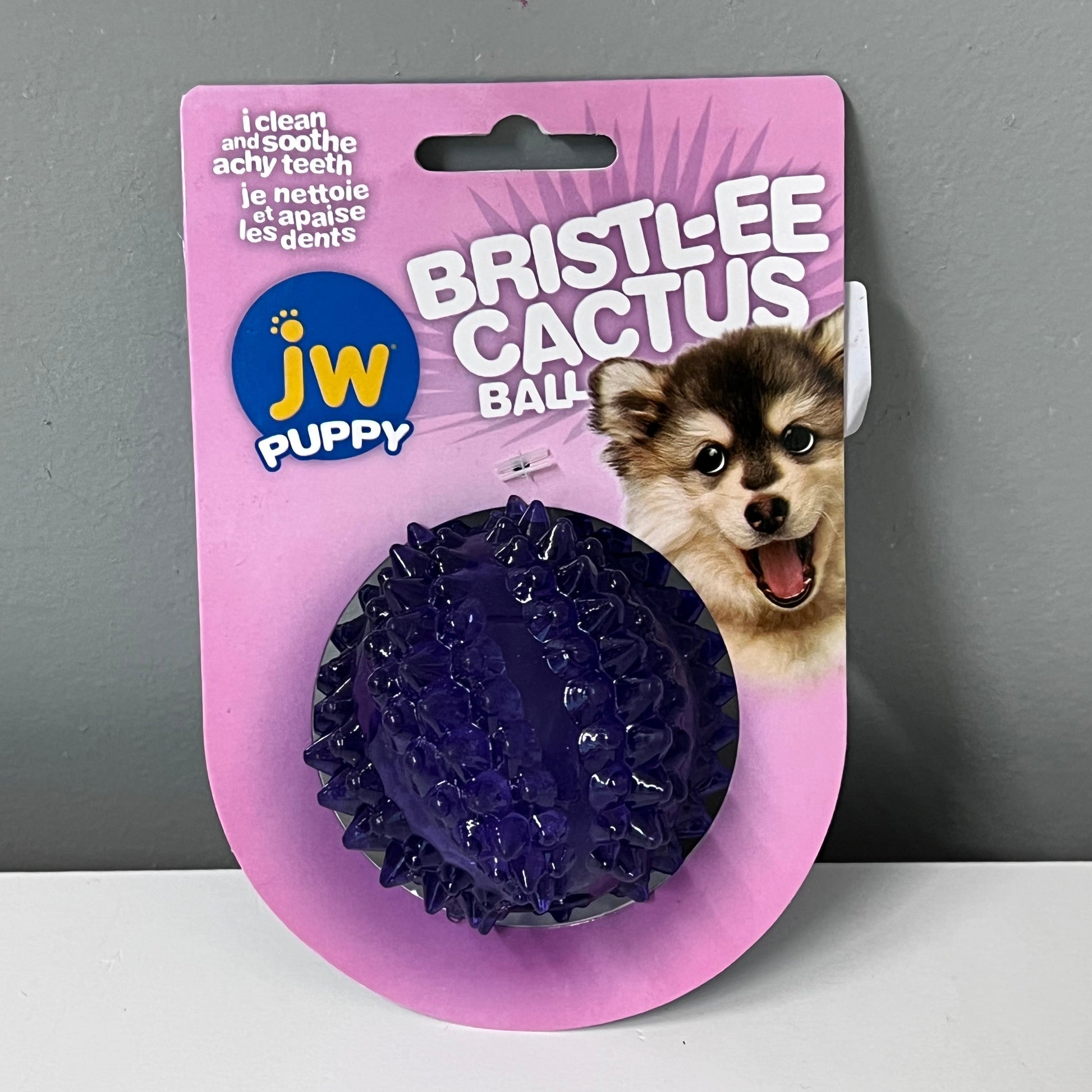 JWs Bristl-ee Cactus Ball Puppy Toy is a teething ball loaded with a variety of rubbery textures that massages and soothe your puppys achy teeth and gums during the teething phase. Great for older, Smallaller dogs too, this toy has a center hole that can be filled with treats that dispense as your dog chews. With a diameter of 3 inches, the Bristl-ee Cactus Ball is perfect for puppies and Smallall dogs.