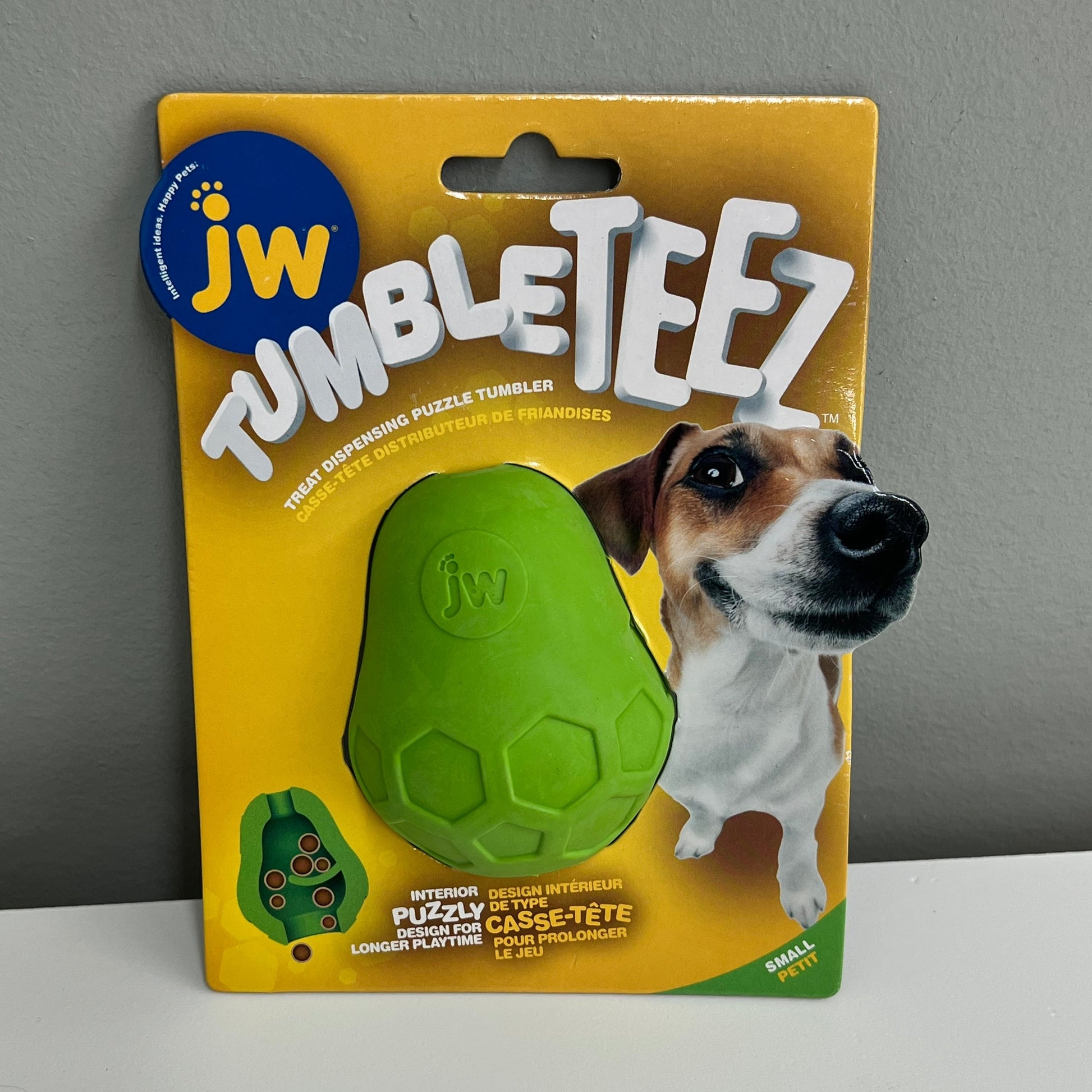 JW Tumble Teez is designed to sporadically dispense treats as your dog plays with the toy. Intelligently designed, the Tumble Teez has a patented internal shelf design that works like a maze for the treat to travel through as your dog nudges and paws at the toy. This challenging puzzle dog toy is designed to keep your dog engaged and makes treat time last longer. Made of natural, non-toxic rubber and constructed with a super thick rubber wall, the Tumble Teez will stand up to all the fun your dog unleashes. The Small is suitable for dogs up to 15 pounds and the Medium is suitable for dogs between 15-40 pounds.