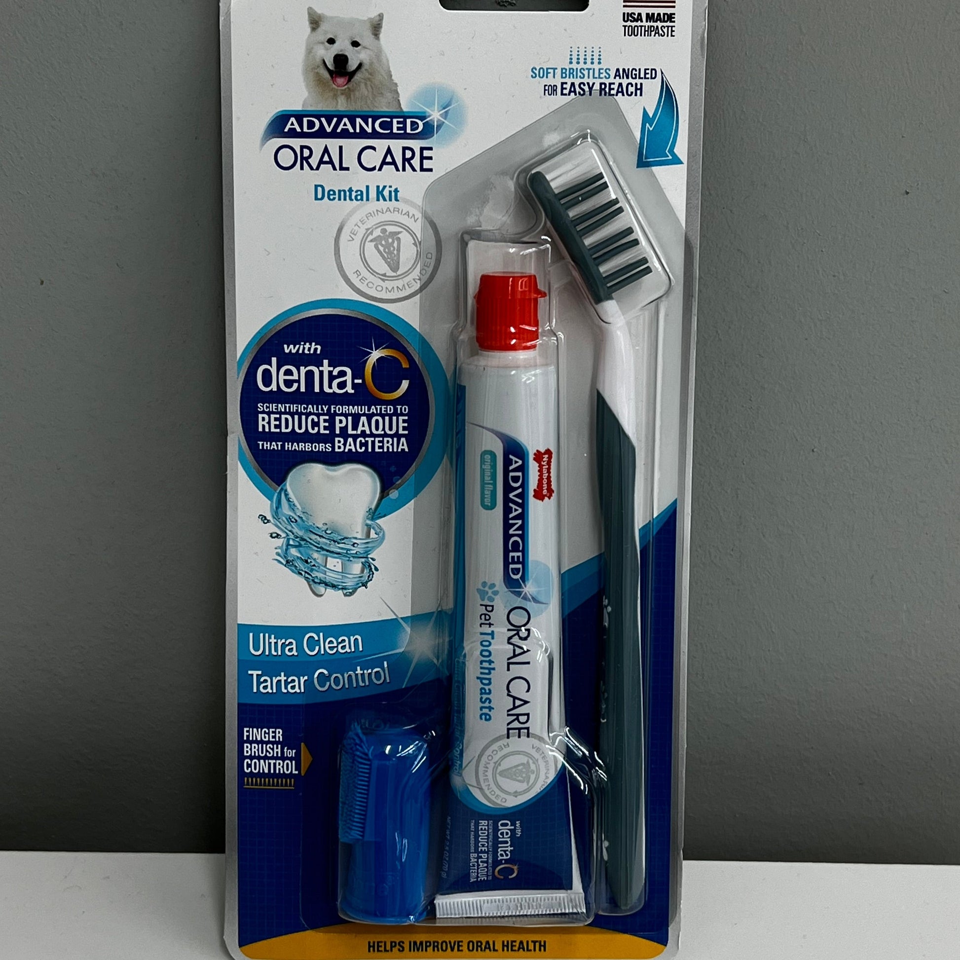 Nylabone Advanced Oral Care Adult Dental Kit comes with a 2.5 oz tube of tartar control toothpaste, a toothbrush with soft, angled bristles and a finger brush. This toothpaste freshens breath, cleans teeth and reduced plaque and tartar. Helps reduce the risk of developing periodontal disease.