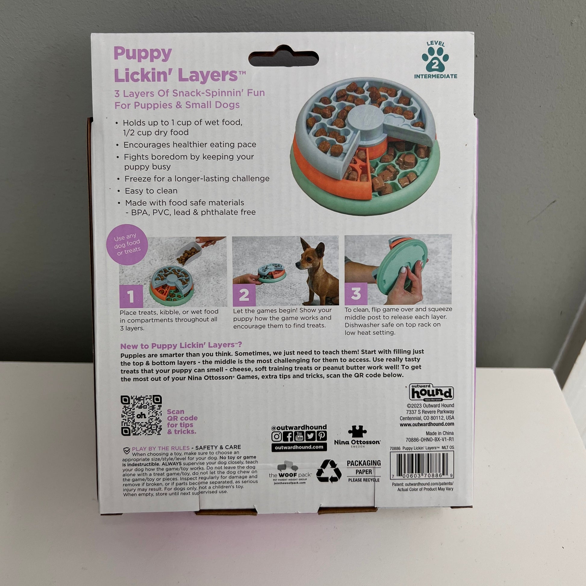 DOG PUZZLE & FEEDER IN ONE: Puppy Lickin' Layers in level 2 with over 70 treat compartments is a dog puzzle game for puppies and small dogs from Nina Ottosson by Outward Hound.