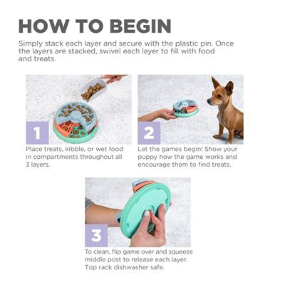 HOW IT WORKS: Place treats, kibble, dry food, or wet food in compartments throughout all 3 layers. Show your dog how the game works and encourage them to find treats. Dogs have to navigate the three layers of food compartments by spinning each one to reveal the treats.