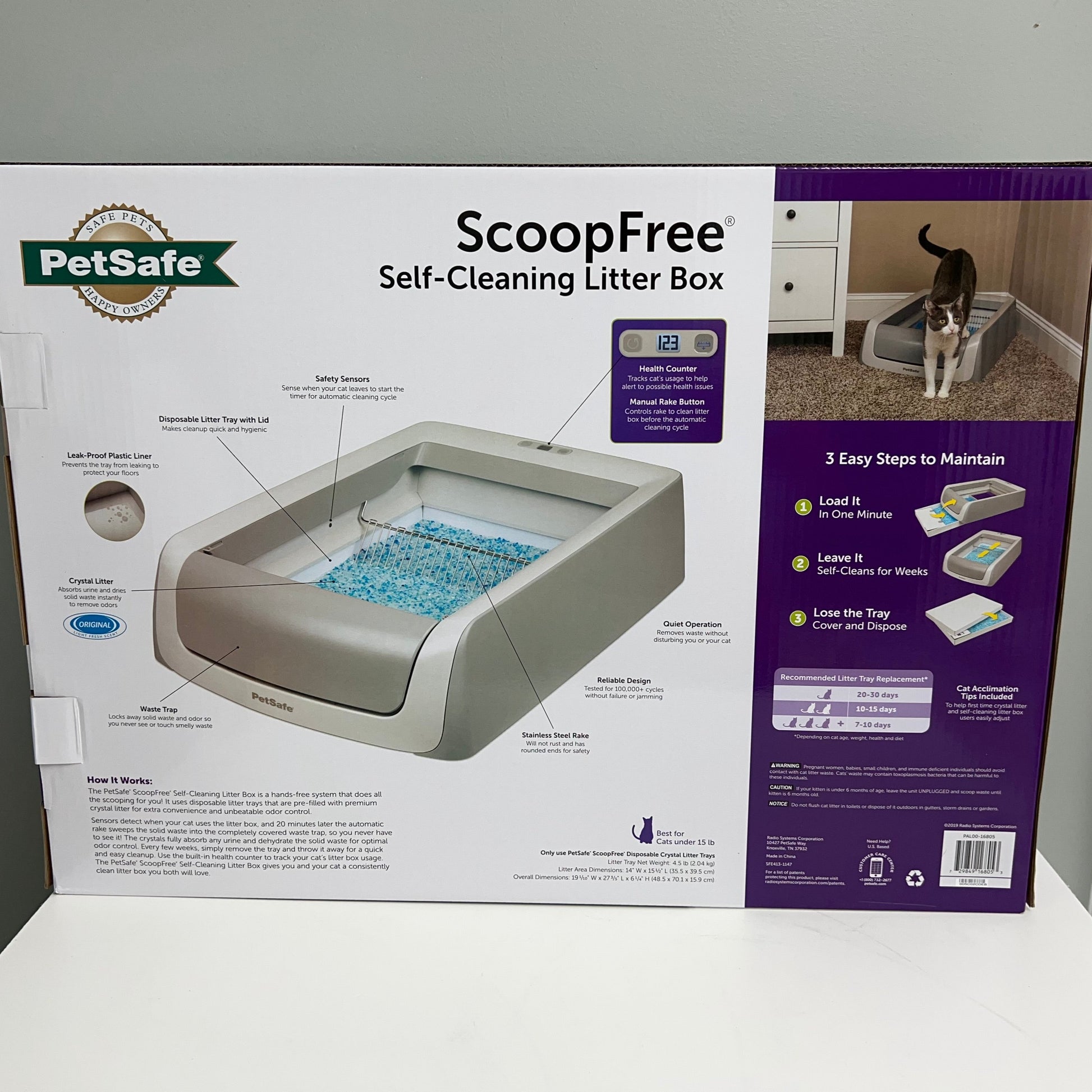 With the ScoopFree® Self-Cleaning Litter Box, there’s no scooping, cleaning or refilling your cat’s litter box for weeks. It uses crystal litter which provides 5 times better odor control than traditional clumping litter. Crystal litter absorbs urine and dehydrates solid waste. This low-tracking litter also helps keep your floors clean because it is 99% dust free and doesn’t stick to your cat’s paws. Safety sensors ensure that the scooping cycle only occurs when your cat is out of the box. It uses disposable trays that have a plastic lining to help protect against leaking, and each tray comes with a lid for quick and easy disposal. Just remove the tray and throw it away. There’s even a health counter that tracks how many times your furry feline uses the box, which is a convenient way to detect early signs of a health issue. PetSafe® brand is here to help you and your pet live happy together™.