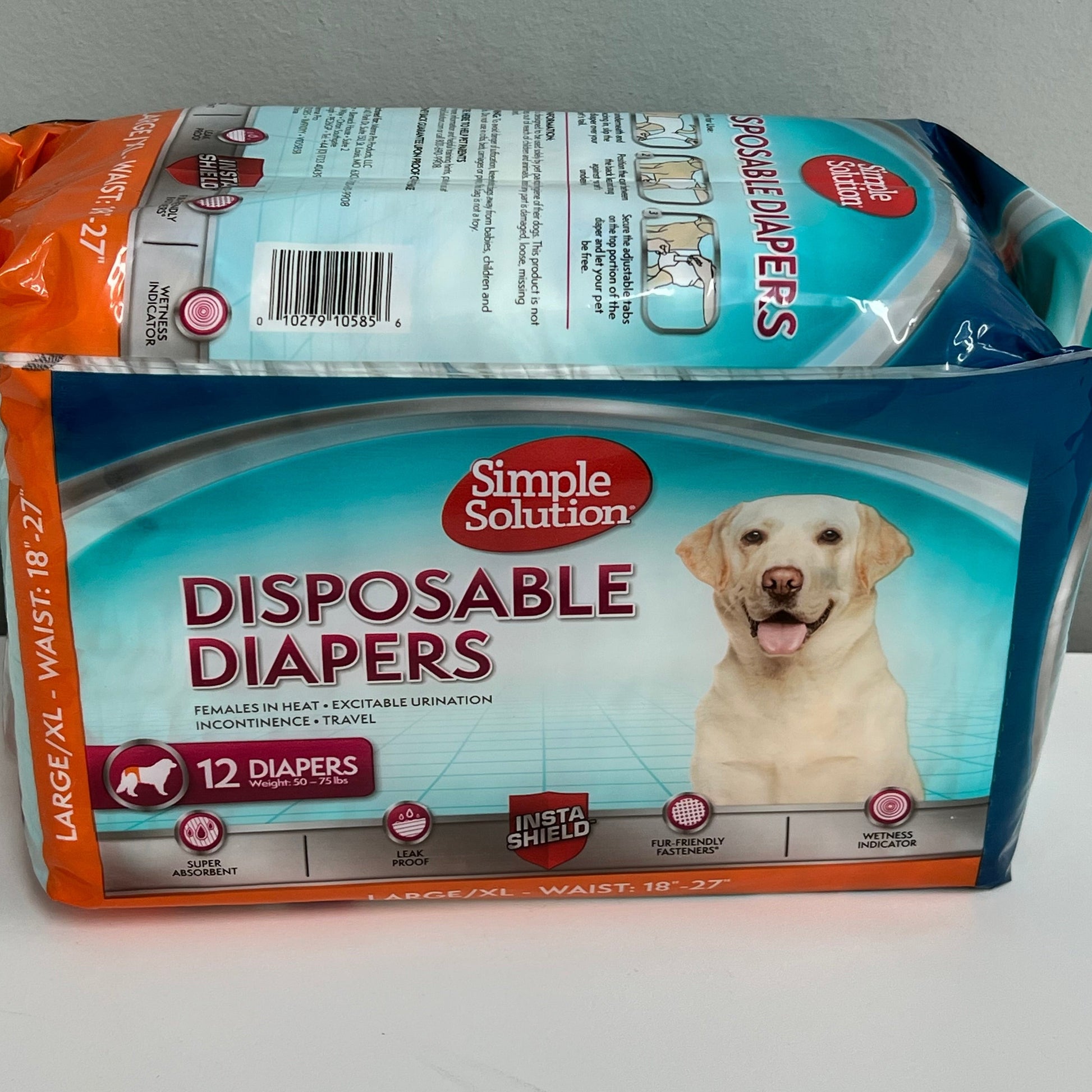 Simple Solution Disposable Diapers offer protection for female dogs with poor bladder control. A unique, stretchable fabric with fur-friendly fasteners fits snugly around your pets waist, where leak-proof barriers and a super absorbent core prevent any mess from spreading to the floor.