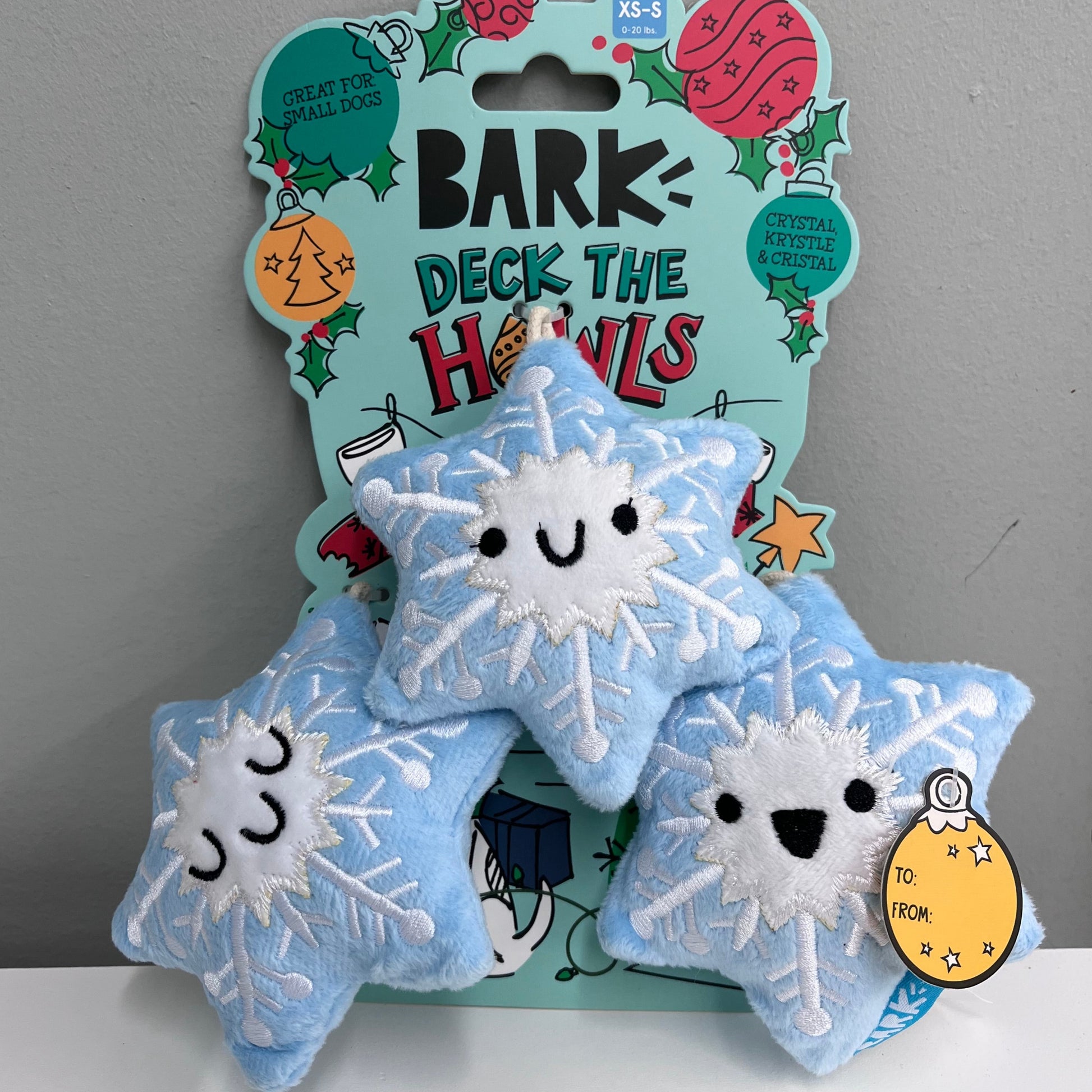 BarkBox Crystal, Krystle and Cristal Holiday Dog Toy are snowflake toys that will make any pup feel special! Three times as unique as normal snowflakes, Crystal, Krystle and Cristal are each packed with fluff and an individual squeaker, making them more fun than a snow day.