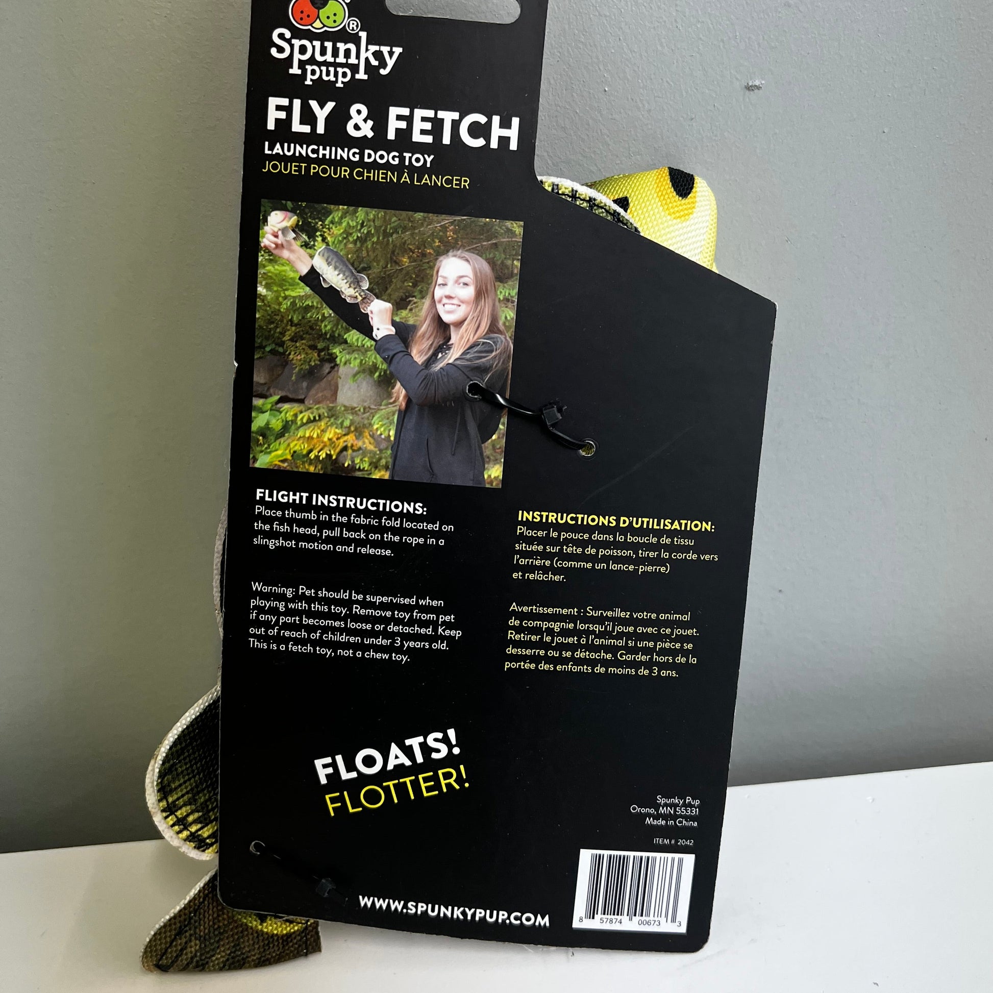 Spunky Pup Fly and Fetch Dog Toy is sure to be your pals favorite hi-flying toy. Pull back on the built-in bungee cord and release it to launch your Fish up to 100 feet in the air. Made from ballistic nylon, plush and cotton rope this fish even floats making it a great addition at the lake, beach or pool.