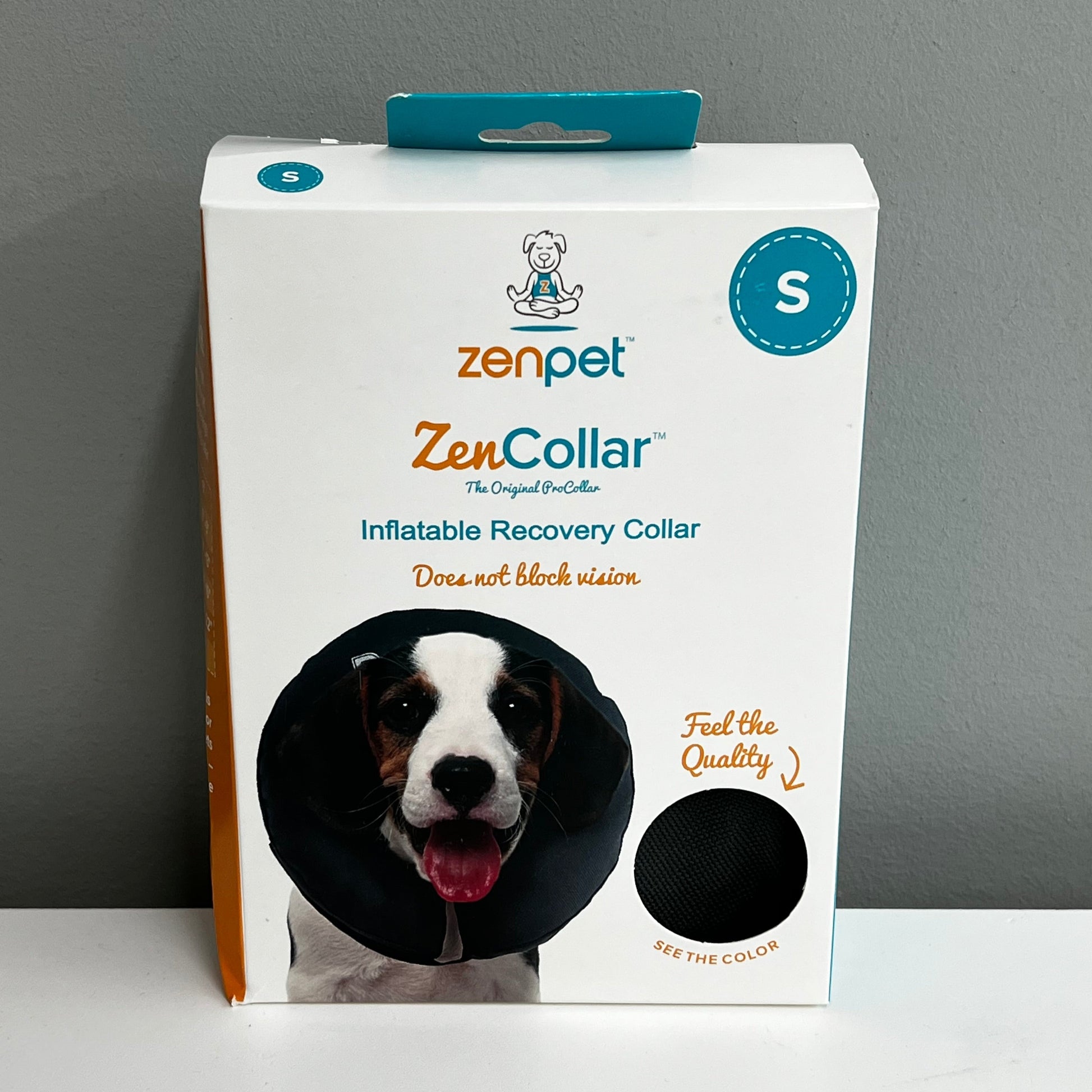 The ZenCollar is a premium protective collar that is designed to protect your pet from reaching injuries, rashes, or post-surgery wounds. The ZenCollar has an inflatable inner bladder made of plastic vinyl that is inflated through a two-way air valve much like a beach ball. Once inflated, the size and thickness of the ZenCollar function as a soft deterrent. The inner bladder is protected by a pliable plastic outer jacket lined with a durable canvas material to resist bites and scratches. The ZenCollar is held in place by inserting the pets everyday collar through the ZenCollars three inner rings. While wearing the ZenCollar, pets are able to eat, sleep and play at ease while staying protected.